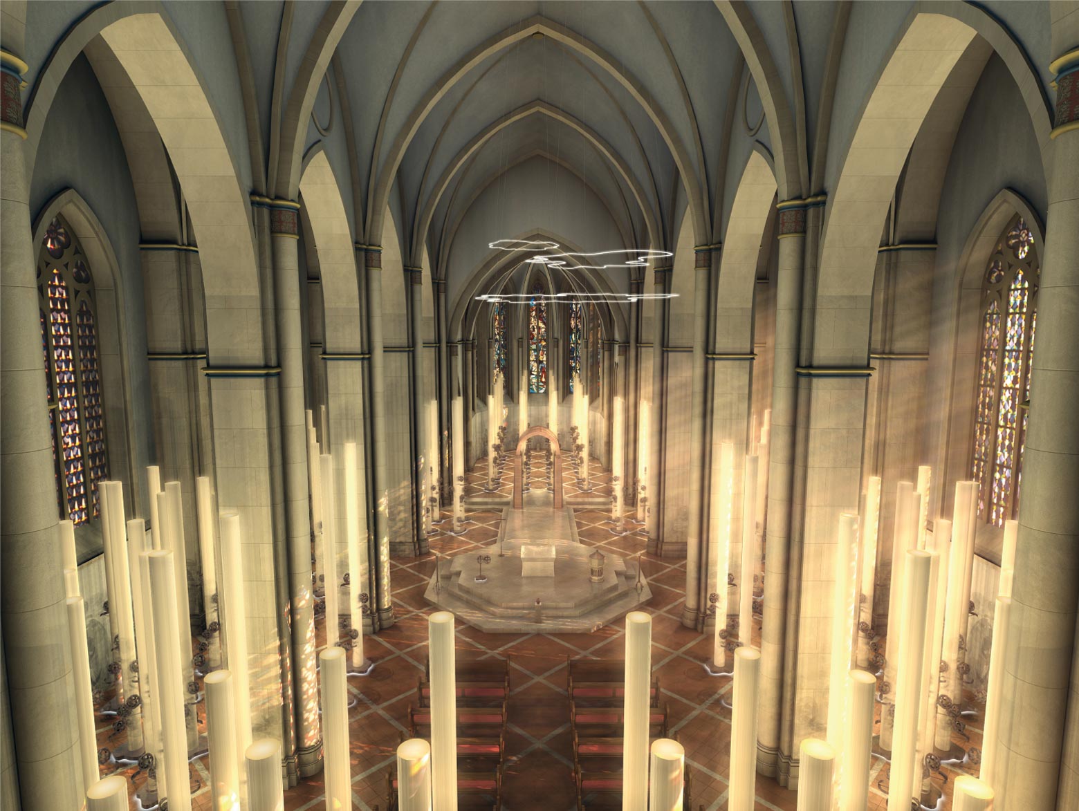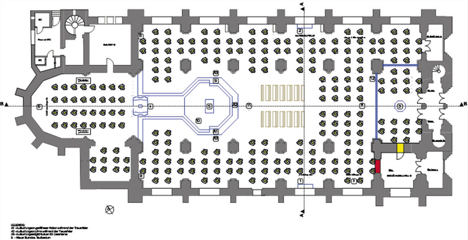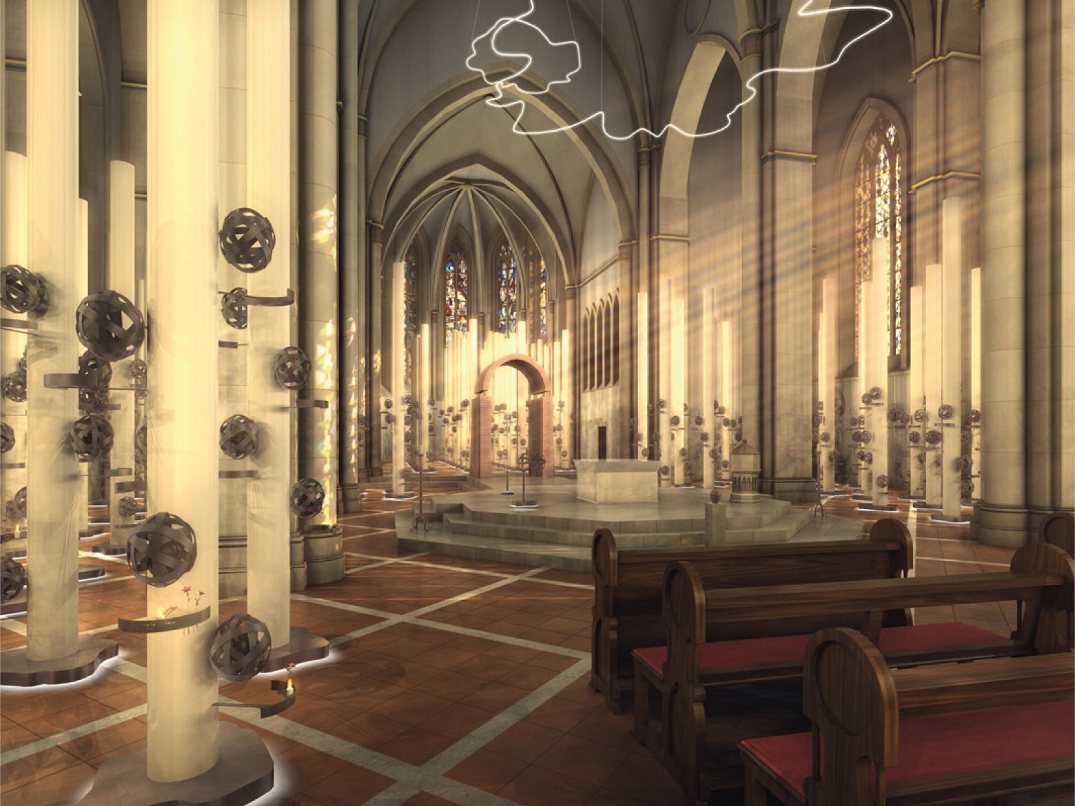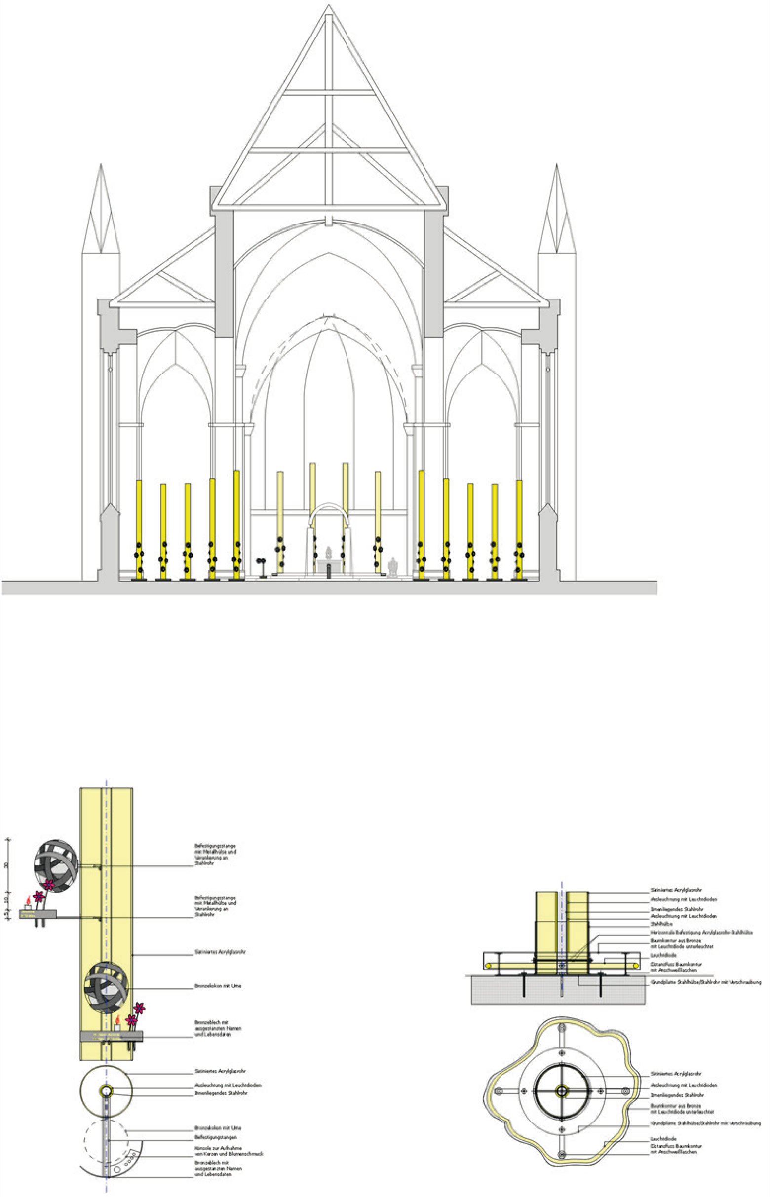 In der Kirche ist ein "Lichtwald" in stalliert, der Kokons mit den Urnen aufnimmt. In der Mitte die Lichtung bestehend aus der bestehenden Altarinsel und hist. Kirchengestühl.